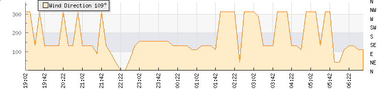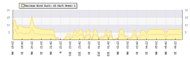 In the last few minutes the wind was South Easterly at an average speed of 7 kmh, reaching up to 14 kmh and a low of 0 kmh. The gust strength is14 kmh above the minimum speed |