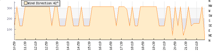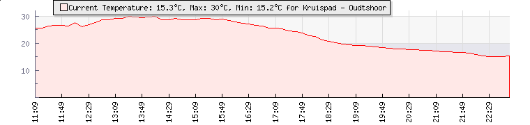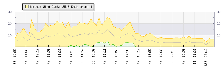 | Wind Gust: | 25 km/h | Min Temp: | 14.2 °C | Max Temp: | 30 °C | | Wind Average: | 15 km/h | Min Hum: | 29 % | Max Hum: | 85 % | |  |