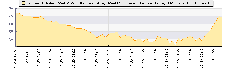 | Wind Speed: | 0|7|14 kmh | Wind Direction: | SE 132° | Temperature: | 17.9°C | | Wet Bulb: | 12.3°C | Discomfort: | 69 | Humidity: | 53% | | Rainfall Today: | 0mm | 12 hrs Rainfall: | 0mm | 24 hrs Rainfall: | 0mm | | Barometer: | 1021.1mb | Dew Point: | 8.2°C | Clouds AGL: | 3888ft (1185 m) | | Density-Alt: | 1430ft (436 m) | Fire Danger: | |