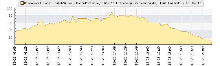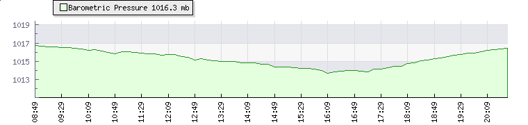 | Wind Speed: | 0|8|16 kmh | Wind Direction: | SE 132° | Temperature: | 23.7°C | | Wet Bulb: | 17°C | Discomfort: | 83 | Humidity: | 51% | | Rainfall Today: | 0mm | 12 hrs Rainfall: | 0mm | 24 hrs Rainfall: | 0mm | | Barometer: | 1015.2mb | Dew Point: | 13°C | Clouds AGL: | 4299ft (1310 m) | | Density-Alt: | 2346ft (715 m) | Fire Danger: | |