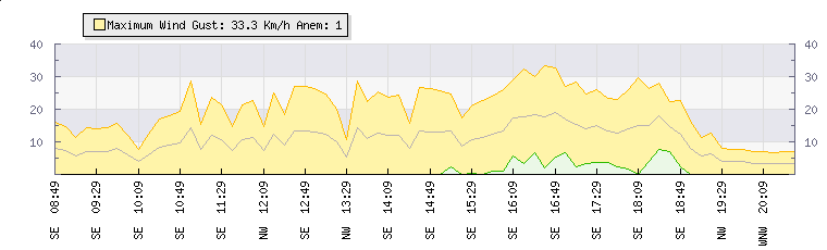 In the last few minutes the wind was South Easterly at an average speed of 8 kmh, reaching up to 16 kmh and a low of 0 kmh. The gust strength is16 kmh above the minimum speed |