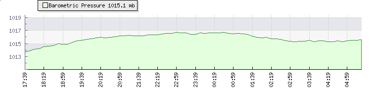 | Wind Speed: | 0|1|2 mph | Wind Direction: | SE 132° | Temperature: | 22.6°C | | Wet Bulb: | 16.6°C | Discomfort: | 82 | Humidity: | 55% | | Rainfall Today: | 0mm | 12 hrs Rainfall: | 0mm | 24 hrs Rainfall: | 0mm | | Barometer: | 1014.8mb | Dew Point: | 13.1°C | Clouds AGL: | 3803ft (1159 m) | | Density-Alt: | 2238ft (682 m) | Fire Danger: | |