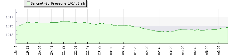 | Wind Speed: | 0|4|7 mph | Wind Direction: | NW 312° | Temperature: | 19°C | | Wet Bulb: | 16.4°C | Discomfort: | 77 | Humidity: | 79% | | Rainfall Today: | 0mm | 12 hrs Rainfall: | 0mm | 24 hrs Rainfall: | 0mm | | Barometer: | 1013.7mb | Dew Point: | 15.3°C | Clouds AGL: | 1492ft (455 m) | | Density-Alt: | 1893ft (577 m) | Fire Danger: | |