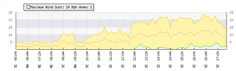 In the last few minutes the wind was South Easterly at an average speed of 11 mph, reaching up to 21 mph and a low of 2 mph. The gust strength is19 mph above the minimum speed |