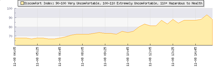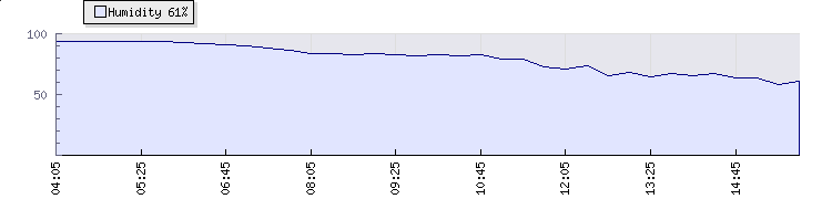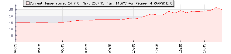 | Wind Gust: | 0 km/h | Min Temp: | 14.6 °C | Max Temp: | 23.6 °C | | Wind Average: | 0 km/h | Min Hum: | 66 % | Max Hum: | 94 % | |  |