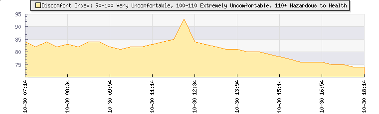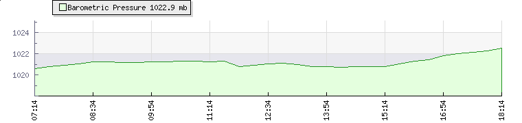 | Wind Speed: | 0|0|0 kmh | Wind Direction: | S 184° | Temperature: | 17.6°C | | Wet Bulb: | 16.9°C | Discomfort: | 76 | Humidity: | 94% | | Rainfall Today: | 1.3mm | 12 hrs Rainfall: | 1.3mm | 24 hrs Rainfall: | 3.4mm | | Barometer: | 1021.7mb | Dew Point: | 16.6°C | Clouds AGL: | 391ft (119 m) | | Density-Alt: | 253ft (77 m) | Fire Danger: | |