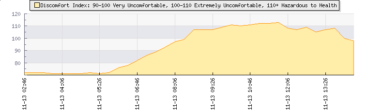 | Wind Speed: | 0|0|0 kmh | Wind Direction: | S 183° | Temperature: | 34.5°C | | Wet Bulb: | 25.2°C | Discomfort: | 109 | Humidity: | 45% | | Rainfall Today: | 0mm | 12 hrs Rainfall: | 0mm | 24 hrs Rainfall: | 0mm | | Barometer: | 1015.3mb | Dew Point: | 20.8°C | Clouds AGL: | 5475ft (1669 m) | | Density-Alt: | 2451ft (747 m) | Fire Danger: | |