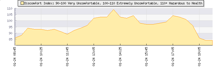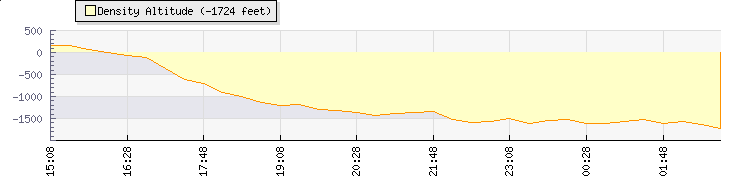 | Wind Speed: | 0|0|0 kmh | Wind Direction: | S 184° | Temperature: | 26.6°C | | Wet Bulb: | 22.4°C | Discomfort: | 96 | Humidity: | 70% | | Rainfall Today: | 0mm | 12 hrs Rainfall: | 0mm | 24 hrs Rainfall: | 0mm | | Barometer: | 1016mb | Dew Point: | 20.7°C | Clouds AGL: | 2373ft (723 m) | | Density-Alt: | 1549ft (472 m) | Fire Danger: | |