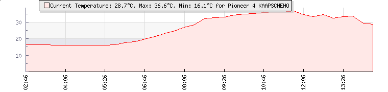| Wind Gust: | 0 km/h | Min Temp: | 16.1 °C | Max Temp: | 36.6 °C | | Wind Average: | 0 km/h | Min Hum: | 42 % | Max Hum: | 94 % | |  |