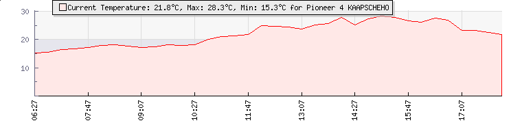 | Wind Gust: | 0 km/h | Min Temp: | 15.1 °C | Max Temp: | 28.3 °C | | Wind Average: | 0 km/h | Min Hum: | 60 % | Max Hum: | 95 % | |  |