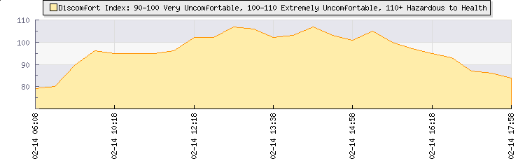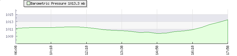 | Wind Speed: | 0|0|0 knots | Wind Direction: | S 183° | Temperature: | 29.4°C | | Wet Bulb: | 23.5°C | Discomfort: | 100 | Humidity: | 60% | | Rainfall Today: | 0mm | 12 hrs Rainfall: | 0mm | 24 hrs Rainfall: | 0mm | | Barometer: | 1010mb | Dew Point: | 20.8°C | Clouds AGL: | 3437ft (1048 m) | | Density-Alt: | 2067ft (630 m) | Fire Danger: | |