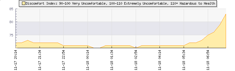 | Wind Speed: | 0|0|0 kmh | Wind Direction: | NNW 340° | Temperature: | 15.9°C | | Wet Bulb: | 15.9°C | Discomfort: | 72 | Humidity: | 100% | | Rainfall Today: | 0mm | 12 hrs Rainfall: | 0mm | 24 hrs Rainfall: | 0mm | | Barometer: | 1015.6mb | Dew Point: | 15.9°C | Density-Alt: | 249ft (76 m) | | Fire Danger: | |