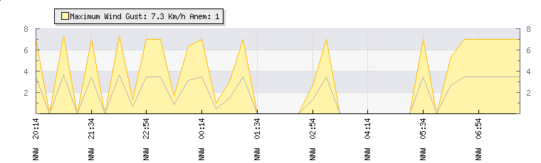 In the last few minutes the wind was North North West at an average speed of 0 kmh, reaching up to 0 kmh and a low of 0 kmh. The gust strength is0 kmh above the minimum speed |