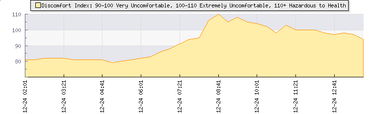 | Wind Speed: | 0|0|0 kmh | Wind Direction: | S 188° | Temperature: | 32.6°C | | Wet Bulb: | 20.8°C | Discomfort: | 100 | Humidity: | 32% | | Rainfall Today: | 0mm | 12 hrs Rainfall: | 0mm | 24 hrs Rainfall: | 0mm | | Barometer: | 1007.5mb | Dew Point: | 13.7°C | Clouds AGL: | 7546ft (2300 m) | | Density-Alt: | 2395ft (730 m) | Fire Danger: | |