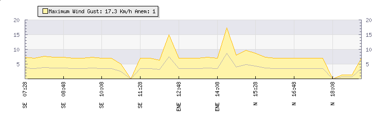 In the last few minutes the wind was South Easterly at an average speed of 0 kmh, reaching up to 0 kmh and a low of 0 kmh. The gust strength is0 kmh above the minimum speed |
