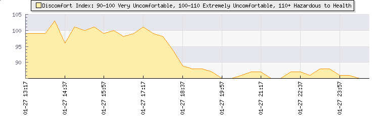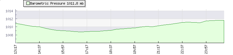 | Wind Speed: | 0|0|0 mph | Wind Direction: | S 188° | Temperature: | 22.8°C | | Wet Bulb: | 20.2°C | Discomfort: | 88 | Humidity: | 80% | | Rainfall Today: | 0mm | 12 hrs Rainfall: | 0mm | 24 hrs Rainfall: | 0mm | | Barometer: | 1011.3mb | Dew Point: | 19.2°C | Clouds AGL: | 1455ft (443 m) | | Density-Alt: | 1247ft (380 m) | Fire Danger: | |