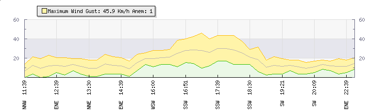 | Wind Gust: | 46 km/h | | | Wind Average: | 30 km/h | | |  |