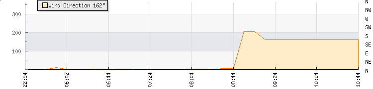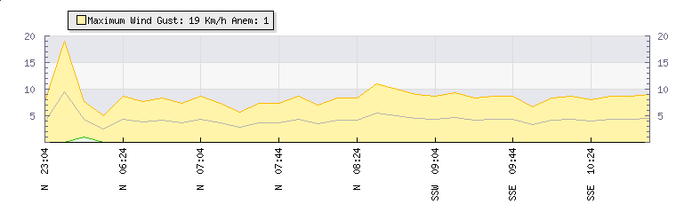 In the last few minutes the wind was Northerly at an average speed of 10 kmh, reaching up to 19 kmh and a low of 0 kmh. The gust strength is19 kmh above the minimum speed |