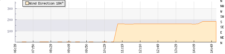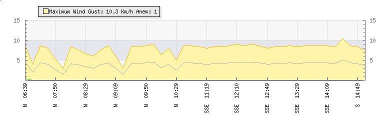 In the last few minutes the wind was South South East at an average speed of 4 kmh, reaching up to 8 kmh and a low of 0 kmh. The gust strength is8 kmh above the minimum speed |