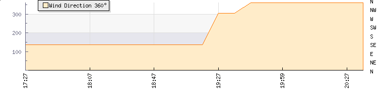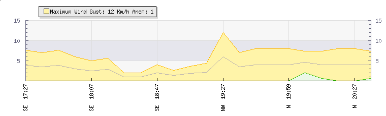 In the last few minutes the wind was Northerly at an average speed of 4 kmh, reaching up to 7 kmh and a low of 1 kmh. The gust strength is6 kmh above the minimum speed |