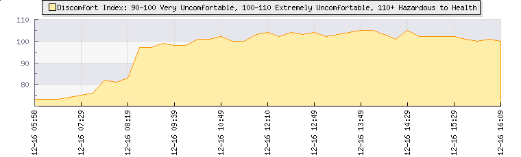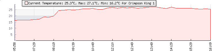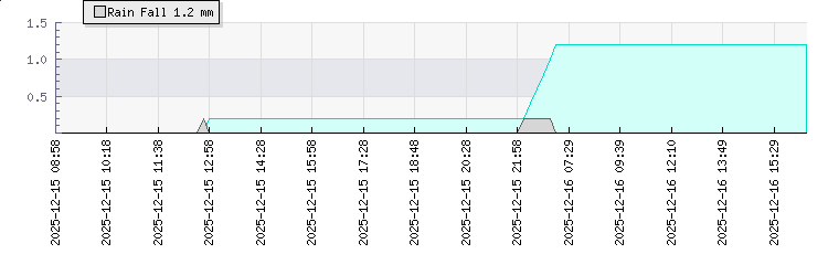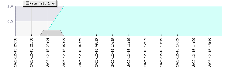 | Wind Gust: | 9 km/h | Min Temp: | 16.5 °C | Max Temp: | 19.7 °C | | Wind Average: | 5 km/h | Min Hum: | 100 % | Max Hum: | 100 % | |  |