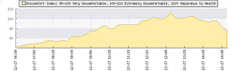 | Wind Speed: | 0|4|8 kmh | Wind Direction: | SSE 162° | Temperature: | 25.6°C | | Wet Bulb: | 25.6°C | Discomfort: | 101 | Humidity: | 100% | | Rainfall Today: | 1.4mm | 12 hrs Rainfall: | 1mm | 24 hrs Rainfall: | 3.8mm | | Barometer: | 940.9mb | Dew Point: | 25.6°C | Density-Alt: | 10049ft (3063 m) | | Fire Danger: | |
