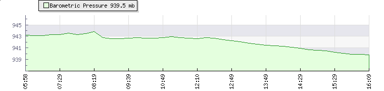 | Wind Speed: | 0|4|8 kmh | Wind Direction: | N 1° | Temperature: | 19.7°C | | Wet Bulb: | 19.7°C | Discomfort: | 83 | Humidity: | 100% | | Rainfall Today: | 0.4mm | 12 hrs Rainfall: | 1mm | 24 hrs Rainfall: | 1.2mm | | Barometer: | 943.5mb | Dew Point: | 19.7°C | Density-Alt: | 9163ft (2793 m) | | Fire Danger: | |