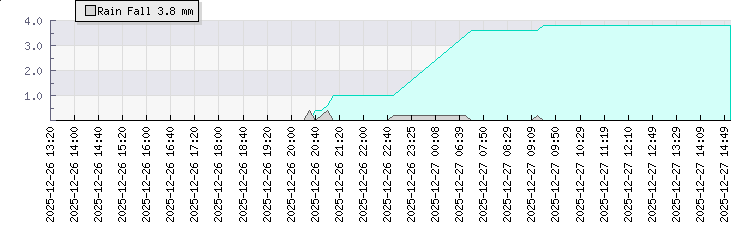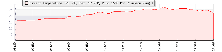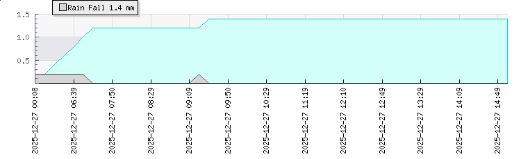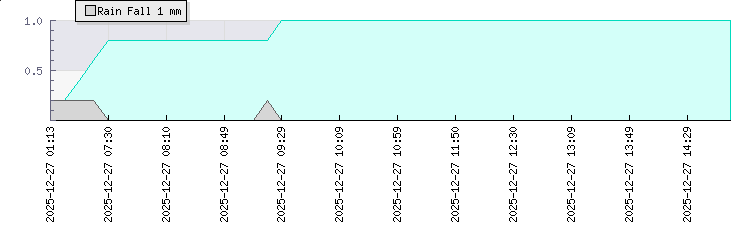 | Wind Gust: | 11 km/h | Min Temp: | 16 °C | Max Temp: | 27.2 °C | | Wind Average: | 8 km/h | Min Hum: | 100 % | Max Hum: | 100 % | |  |