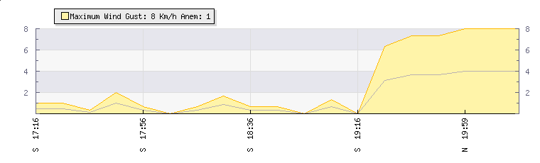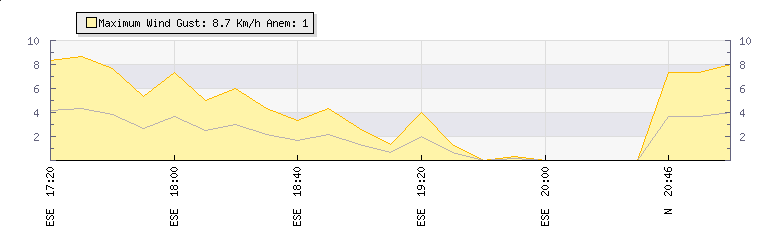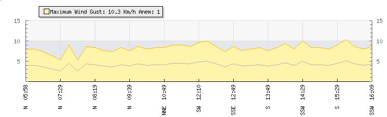 In the last few minutes the wind was Northerly at an average speed of 4 kmh, reaching up to 8 kmh and a low of 0 kmh. The gust strength is8 kmh above the minimum speed |
