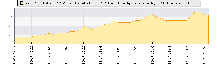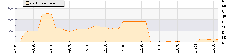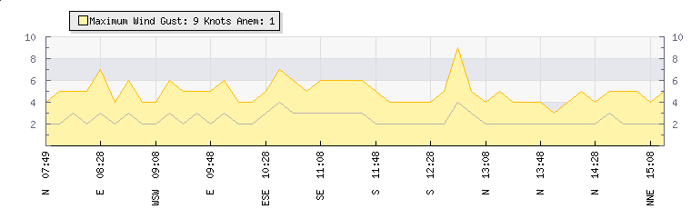 | Wind Gust: | 9 knots | Min Temp: | 14.9 °C | Max Temp: | 19 °C | | Wind Average: | 4 knots | Min Hum: | 100 % | Max Hum: | 100 % | |  |