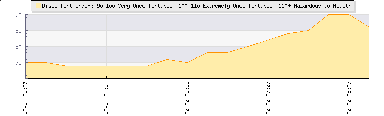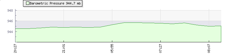 | Wind Speed: | 0|2|4 knots | Wind Direction: | N 1° | Temperature: | 17.1°C | | Wet Bulb: | 17.1°C | Discomfort: | 75 | Humidity: | 100% | | Rainfall Today: | 0.2mm | 12 hrs Rainfall: | 1.4mm | 24 hrs Rainfall: | 3.6mm | | Barometer: | 944.9mb | Dew Point: | 17.1°C | Density-Alt: | 8776ft (2675 m) | | Fire Danger: | |