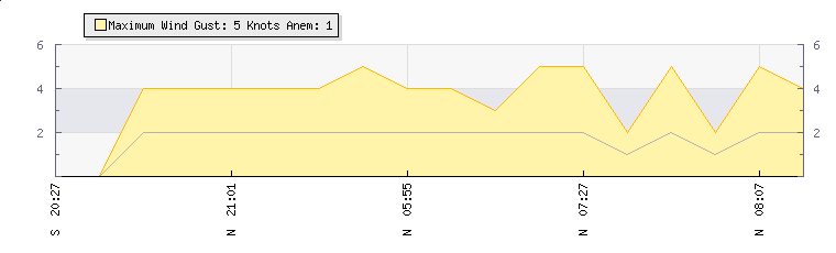 | Wind Gust: | 0 knots | Min Temp: | 100 °C | Max Temp: | -50 °C | | Wind Average: | 0 knots | Min Hum: | 100 % | Max Hum: | 0 % | |  |