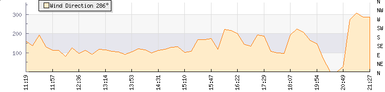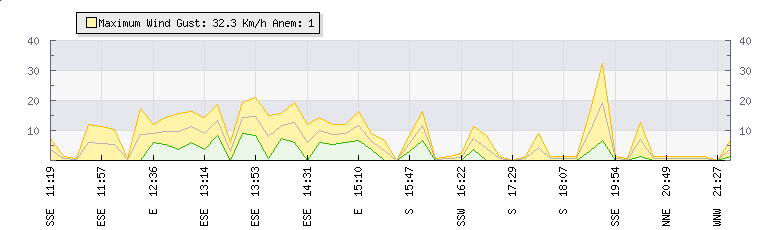 In the last few minutes the wind was South South East at an average speed of 1 kmh, reaching up to 2 kmh and a low of 0 kmh. The gust strength is2 kmh above the minimum speed |