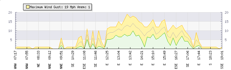 In the last few minutes the wind was West North West at an average speed of 1 mph, reaching up to 1 mph and a low of 0 mph. The gust strength is1 mph above the minimum speed |