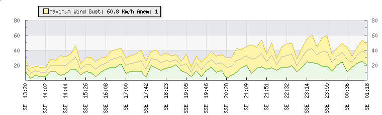 In the last few minutes the wind was South Easterly at an average speed of 20 kmh, reaching up to 28 kmh and a low of 11 kmh. The gust strength is17 kmh above the minimum speed |