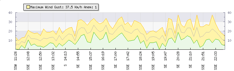 In the last few minutes the wind was South South East at an average speed of 16 kmh, reaching up to 21 kmh and a low of 11 kmh. The gust strength is10 kmh above the minimum speed |