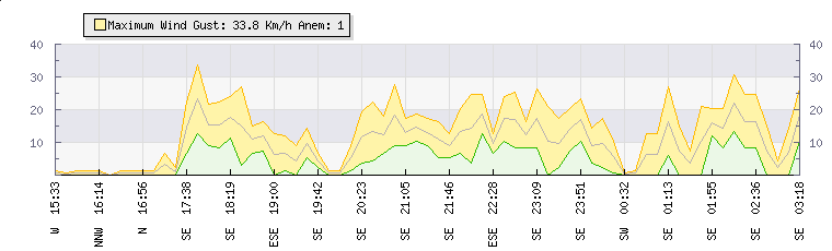 In the last few minutes the wind was South Easterly at an average speed of 16 kmh, reaching up to 20 kmh and a low of 12 kmh. The gust strength is8 kmh above the minimum speed |