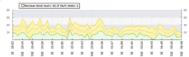 In the last few minutes the wind was South Easterly at an average speed of 30 kmh, reaching up to 43 kmh and a low of 18 kmh. The gust strength is25 kmh above the minimum speed |