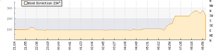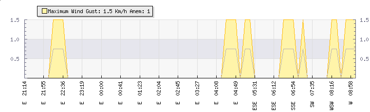 In the last few minutes the wind was South Westerly at an average speed of 0 kmh, reaching up to 0 kmh and a low of 0 kmh. The gust strength is0 kmh above the minimum speed |