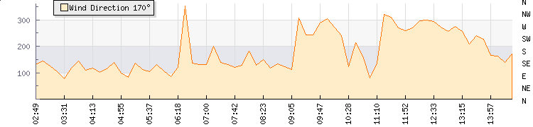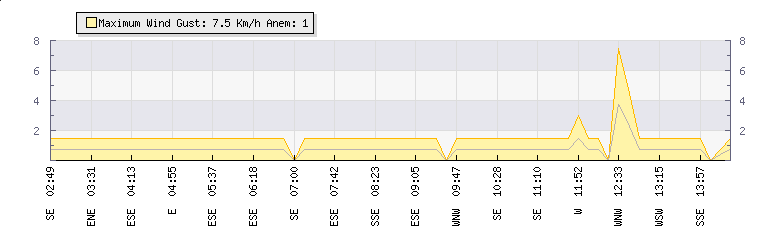 In the last few minutes the wind was West South West at an average speed of 1 kmh, reaching up to 2 kmh and a low of 0 kmh. The gust strength is2 kmh above the minimum speed |