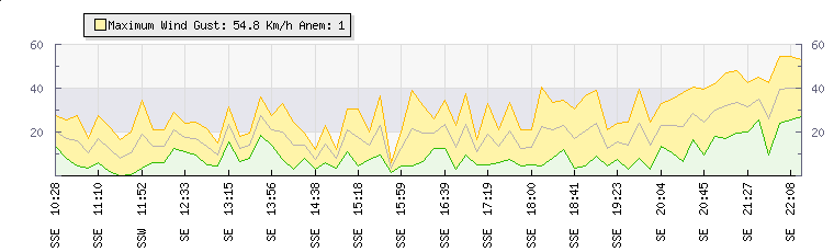 In the last few minutes the wind was Southerly at an average speed of 16 kmh, reaching up to 28 kmh and a low of 5 kmh. The gust strength is23 kmh above the minimum speed |
