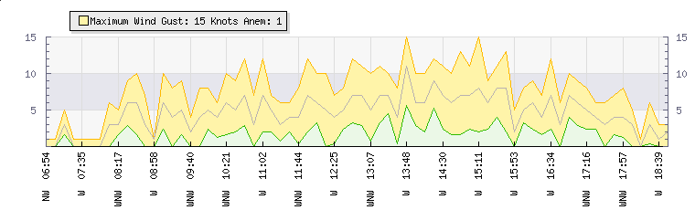 In the last few minutes the wind was North North West at an average speed of 3 knots, reaching up to 6 knots and a low of 0 knots. The gust strength is6 knots above the minimum speed |
