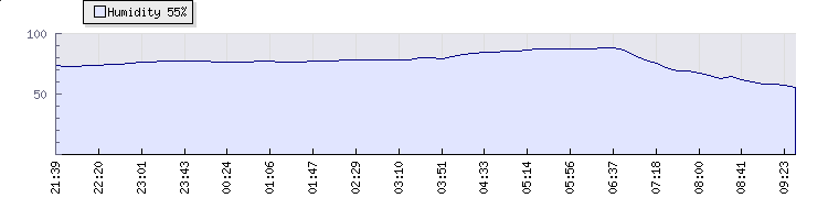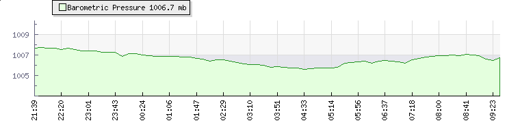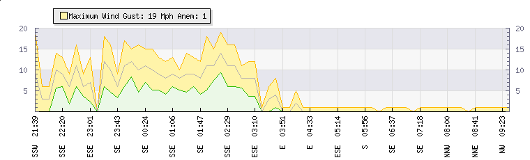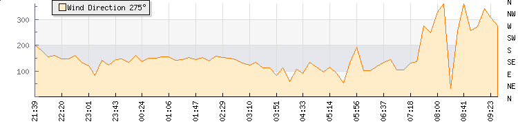 In the last few minutes the wind was Westerly at an average speed of 1 mph, reaching up to 1 mph and a low of 0 mph. The gust strength is1 mph above the minimum speed |