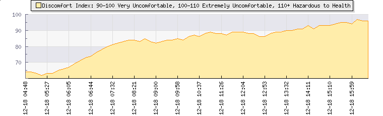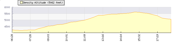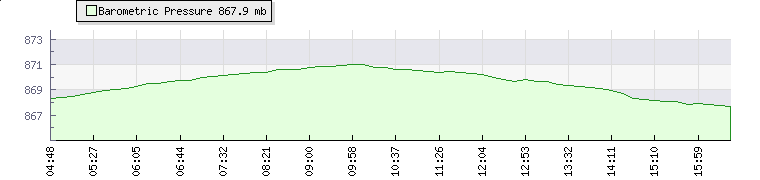 | Wind Speed: | 0|0|0 kmh | Wind Direction: | ESE 112° | Temperature: | 18.6°C | | Wet Bulb: | 17.8°C | Discomfort: | 79 | Humidity: | 93% | | Rainfall Today: | 0mm | 12 hrs Rainfall: | 0mm | 24 hrs Rainfall: | 1.4mm | | Barometer: | 869.7mb | Dew Point: | 17.5°C | Clouds AGL: | 462ft (141 m) | | Density-Alt: | 5817ft (1773 m) | Fire Danger: | |