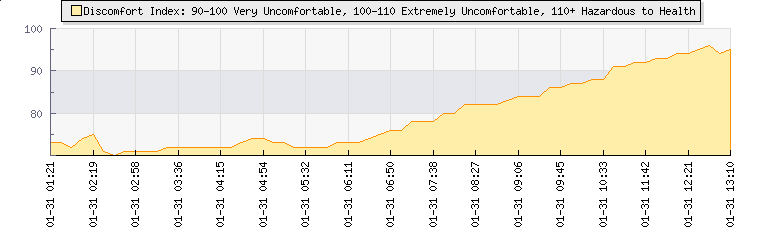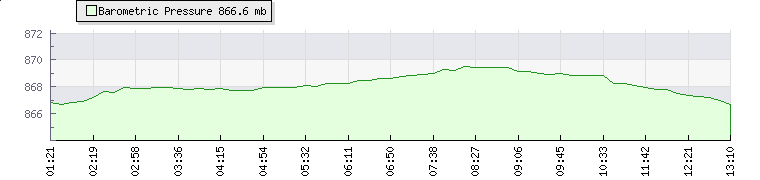 | Wind Speed: | 1|6|11 kmh | Wind Direction: | ESE 112° | Temperature: | 31.8°C | | Wet Bulb: | 22.5°C | Discomfort: | 101 | Humidity: | 43% | | Rainfall Today: | 0mm | 12 hrs Rainfall: | 0mm | 24 hrs Rainfall: | 3.1mm | | Barometer: | 868mb | Dew Point: | 17.6°C | Clouds AGL: | 5659ft (1725 m) | | Density-Alt: | 7326ft (2233 m) | Fire Danger: | |