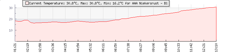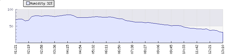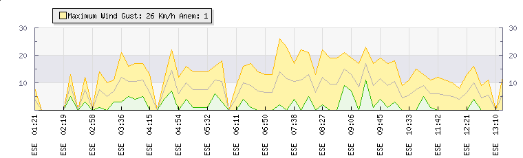 | Wind Gust: | 26 km/h | Min Temp: | 18.9 °C | Max Temp: | 31.8 °C | | Wind Average: | 17 km/h | Min Hum: | 43 % | Max Hum: | 84 % | |  |