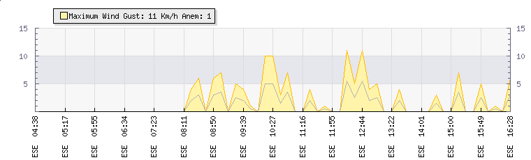 In the last few minutes the wind was East South East at an average speed of 0 kmh, reaching up to 0 kmh and a low of 0 kmh. The gust strength is0 kmh above the minimum speed |