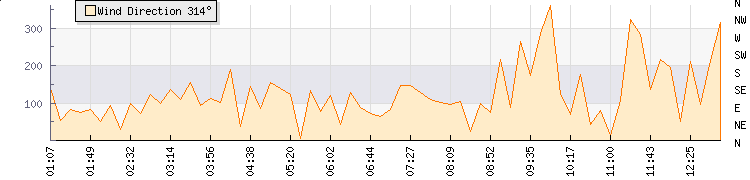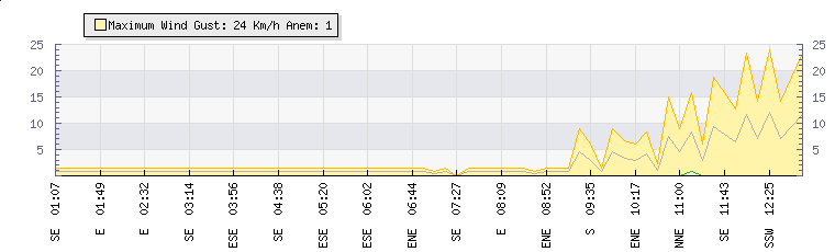 In the last few minutes the wind was North North East at an average speed of 5 kmh, reaching up to 9 kmh and a low of 0 kmh. The gust strength is9 kmh above the minimum speed |