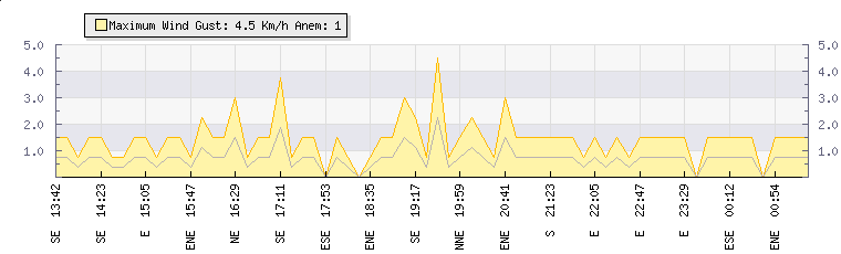 In the last few minutes the wind was Easterly at an average speed of 1 kmh, reaching up to 2 kmh and a low of 0 kmh. The gust strength is2 kmh above the minimum speed |