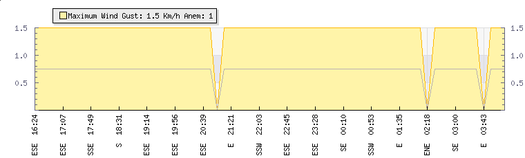 In the last few minutes the wind was South Easterly at an average speed of 1 kmh, reaching up to 2 kmh and a low of 0 kmh. The gust strength is2 kmh above the minimum speed |